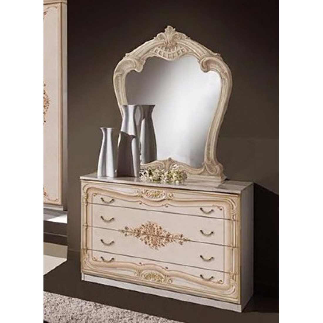 Комод с зеркалом Диана (беж) от Российской фабрики «ДИА мебель» выполнен в бежевом глянцевом цвете. Большое зеркало с легкостью украсит и визуально расширит и осветлит комнату. Такой комод в классическом стиле не займет много места, будет незаменимым модулем в вашей спальне.