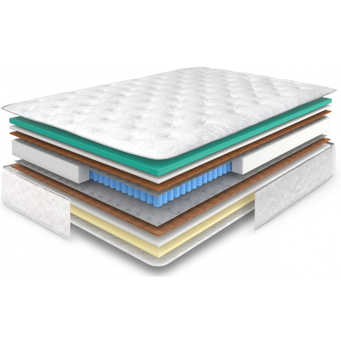 Наполнение: Memory Cool 40 мм, ортопена 20 мм, натуральный латекс 20 мм, латексированная кокосовая койра 10 мм, спанбонд, блок независимых пружин, усиление матраса по периметру.