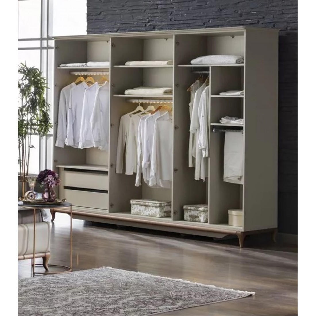 Шкаф платяной 6-дверный серии Pesaro Bellona. Изготовлен из высококачественного ЛДСП производства Турция, класс эмиссии формальдегидов Е1. Зеркальная дверь в центре с прямоугольной ручкой, двери справа и слева со вставками серого цвета и большими круглыми ручками под бронзу. Ножки и рамка из натурального дерева с оттенком медовый орех. Размеры и наполнение шкафа позволит аккуратно разместить большое количество вещей. Двери и ящики с доводчиками, обеспечивающими плавный ход и безопасность.