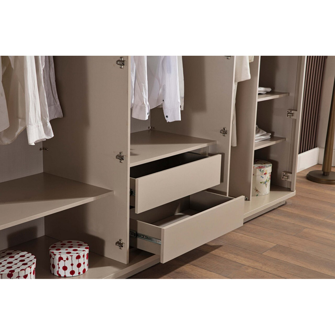Три внутринних отсека, а так же глубина 660мм шкафа  Санвито SANV-34   позволяет разместить достаточно большое количество полок для белья, штанг для одежды, а так же ящики для хранения!  Плавное закрытие крайних дверок  обеспечивается системой push-open .