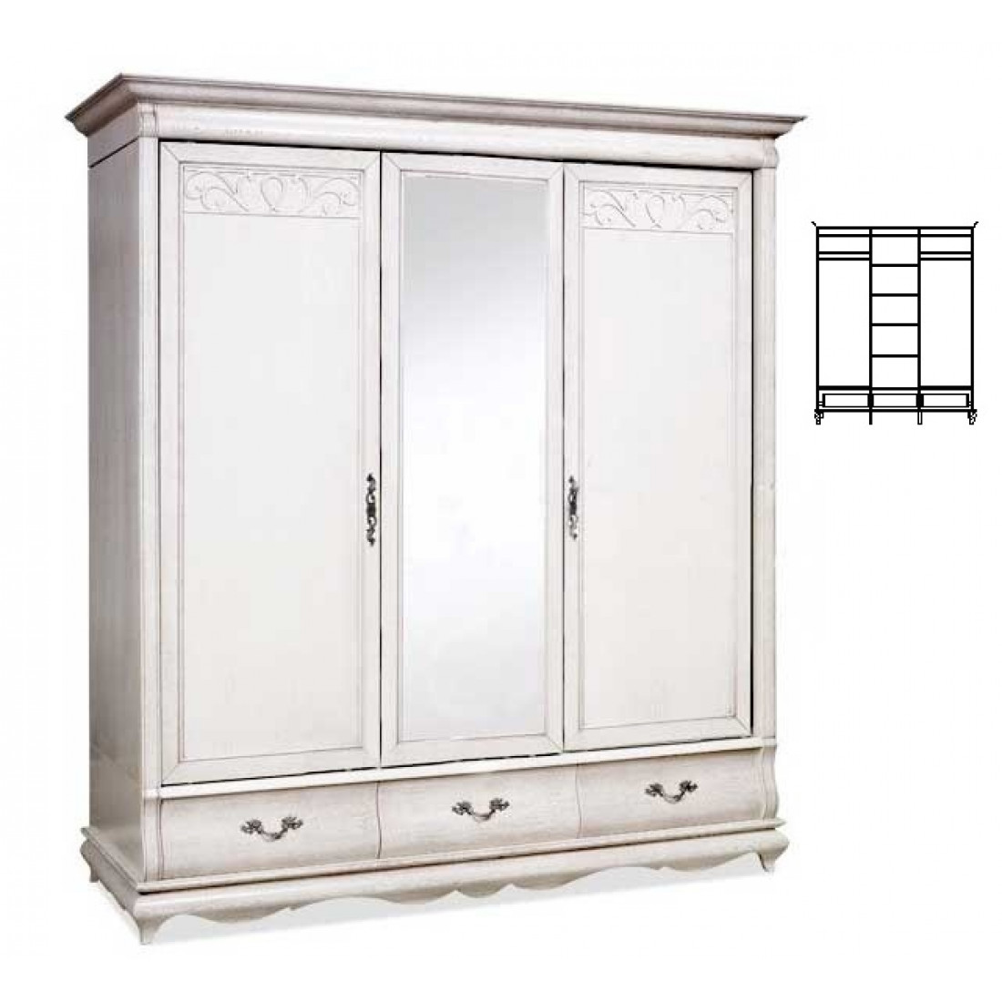Классический трехдверный гардероб с зеркалом из коллекции мебели для спальни "Оскар" прекрасно впишется в интерьер спальни. Декорирован высокими карнизами, изящной резьбой и зеркальной поверхностью на центральной двери. Модель выполнена в цветовом решении "Белая эмаль с патиной".